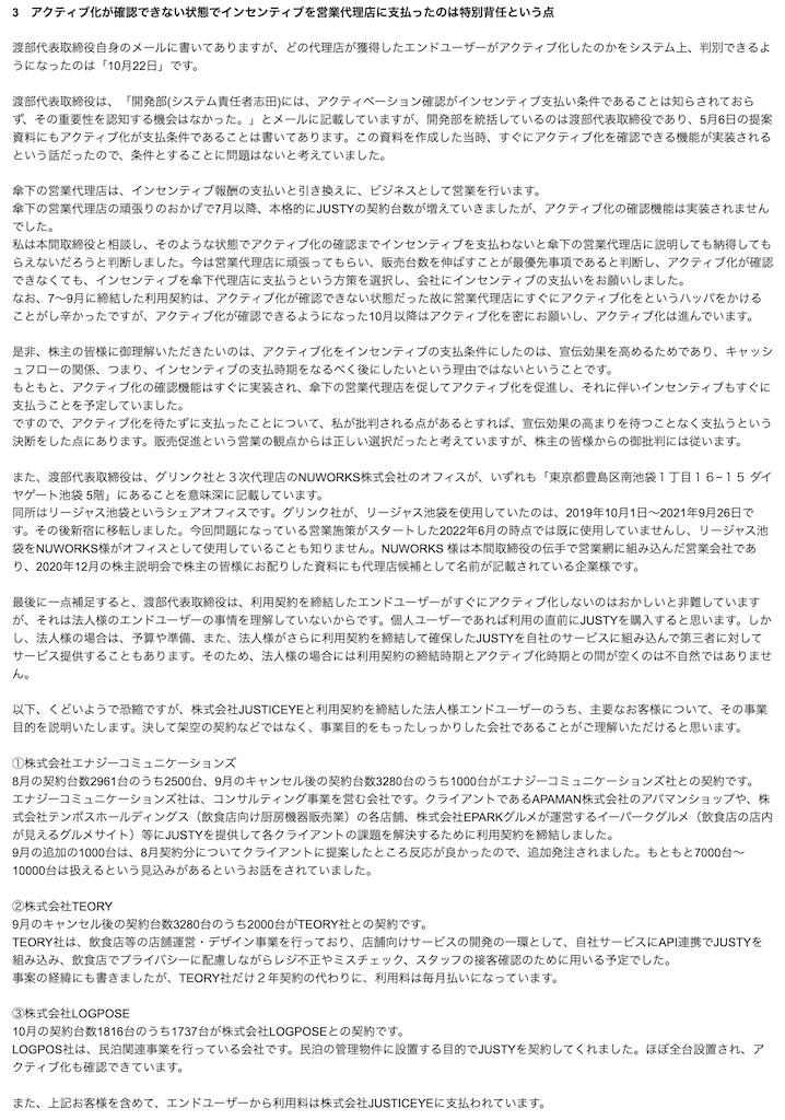 以下、清田が2022年12月6日に当社株主に送った虚偽の釈明メール